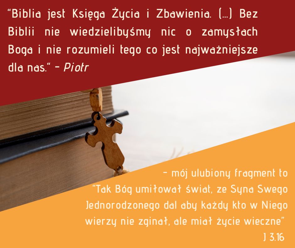 „Biblia jest Księga Życia i Zbawienia. Opisuje wielkie dzieła Boże. Uczy nas jak żyć, aby osiągnąć zbawienie i kim jest Jezus Chrystus, nasz Odkupiciel. Bez Biblii nie wiedzielibyśmy nic o zamysłach Boga i nie rozumieli tego co jest najważniejsze dla nas.” – Piotr