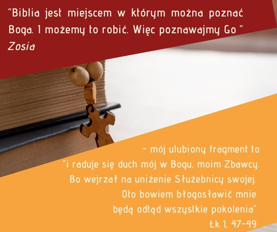 „W latach 1994/95 byłam w postulacie zgromadzenia zakonnego. Były tam organizowane wykłady biblijne dla nowicjuszek prowadzone przez wykładowcę. Po jednym z takich wykładów powiedział on że takich rzeczy nie mówią na kazaniach ponieważ ludzie by tego nie zrozumieli. Dopiero gdy nadszedł rok 2000 i list apostolski tertio milennio adveniente pojawiły się w mojej parafii pogłębione treści biblijne. Biblia jest miejscem w którym można poznać Boga. I możemy to robić. Więc poznawajmy Go ” .